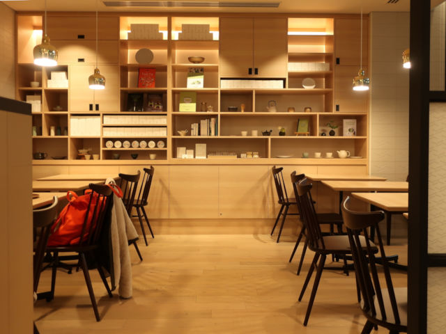 そして入口右手にセミナー等が開けるよう16席ちょっとほどのフロアがあり、こちらはテーブル席で構成され、南側の壁面には日本茶やそれら茶道具がディスプレイされる。