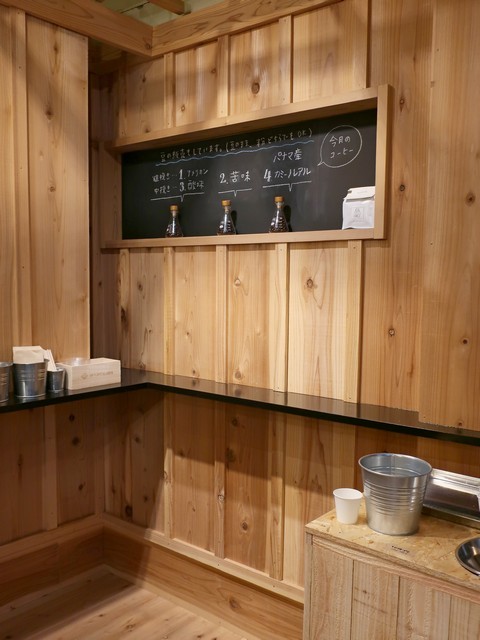 客席は窓際のカウンター席3つのみ、あとは奥にスタンディングカウンター、店頭の腰掛けがあり、板張りの壁面にはコーヒースタンドなりの主張が。