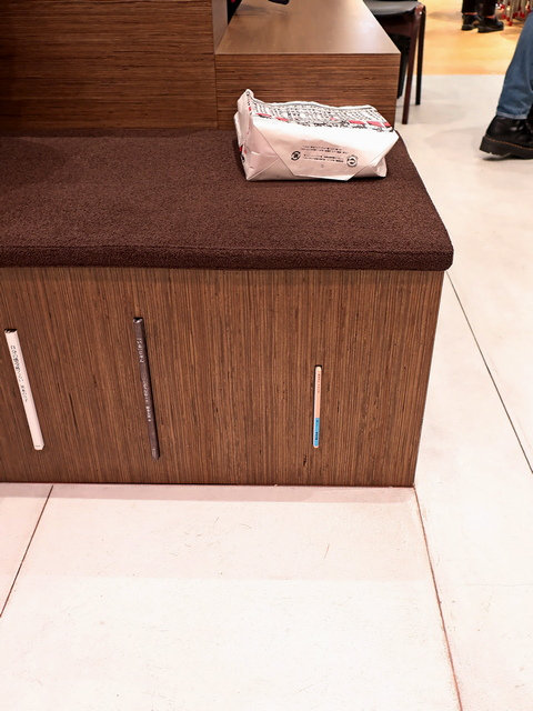 客席は主にベンチ系が主力であり、橋の方にテーブル席が10数席あるが、真ん中の腰掛けには足元に本が仕込まれていたりと(もちろん閲覧も可能)。