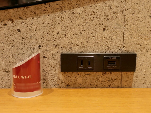 もちろんカウンター席にもコンセントが(こちらは1口+USB充電ポート1口)。あれ、注文票入れにWi-FiのPASSが。