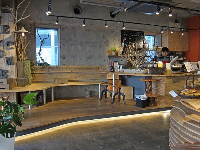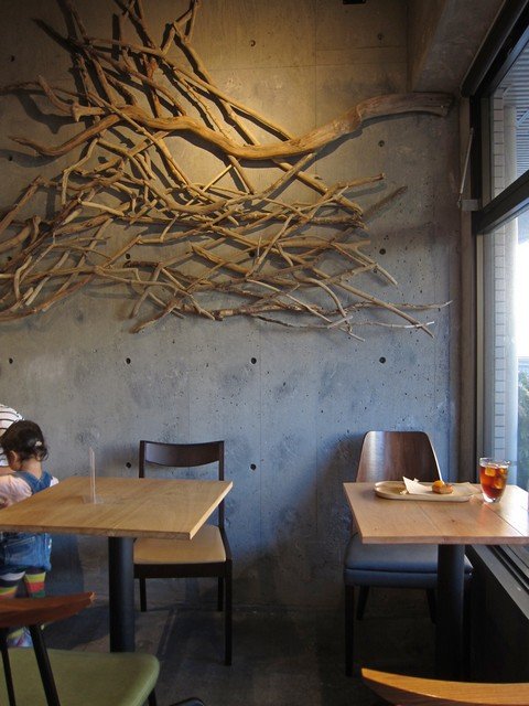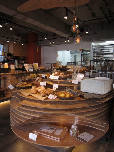 入るとコンクリ打ちっぱなしのハコに流木を主体としたインテリア。2フロアあり、入って正面側のフロアやや奥にレジがあり、その奥にベーカリー工房が。