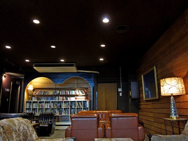 2Fはちょっと薄暗く脂けた空間に喫茶店的要素のある空間。ソファー席が階段側から奥に30席程度、手前側(商店街側)窓際に沿って6席ほどといった構成。奥には古いながらも本棚に書籍がびっしりと並ぶ。