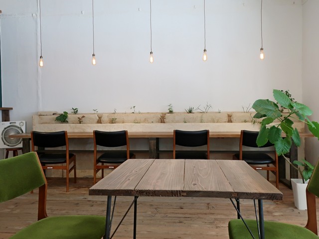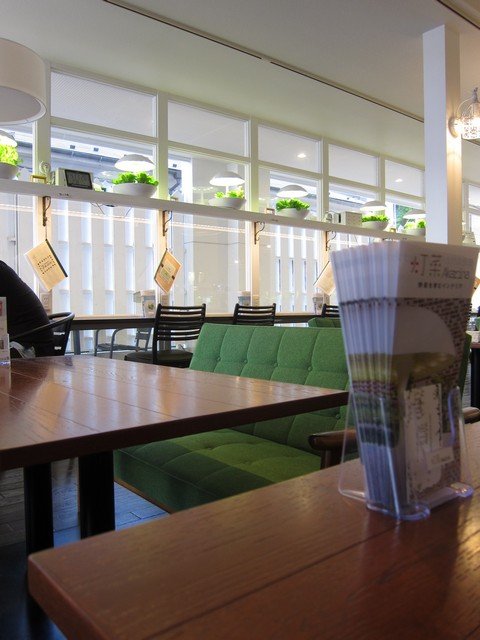 お店は奥に長く、白を基調としたハコ、入口入ってすぐ左手がLED水耕栽培のショールーム的なエリアとなっており、右手窓際にそってカウンター席があり、窓枠にコンセント(2口×7ヶ所)が。棚にもLED水耕栽培の鉢が飾られており、中央のローテーブル席は緑のクッションのカリモク60のKチェアといった緑の映えるインテリア。全体で店内30席程度、さらに奥に中庭のテラス席も設定といった見た目以上にキャパを持つ。