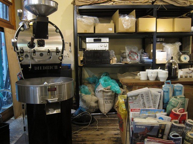 入ると左手すぐにDIEDRICHの焙煎機がお出迎え。脇には新聞紙も。
